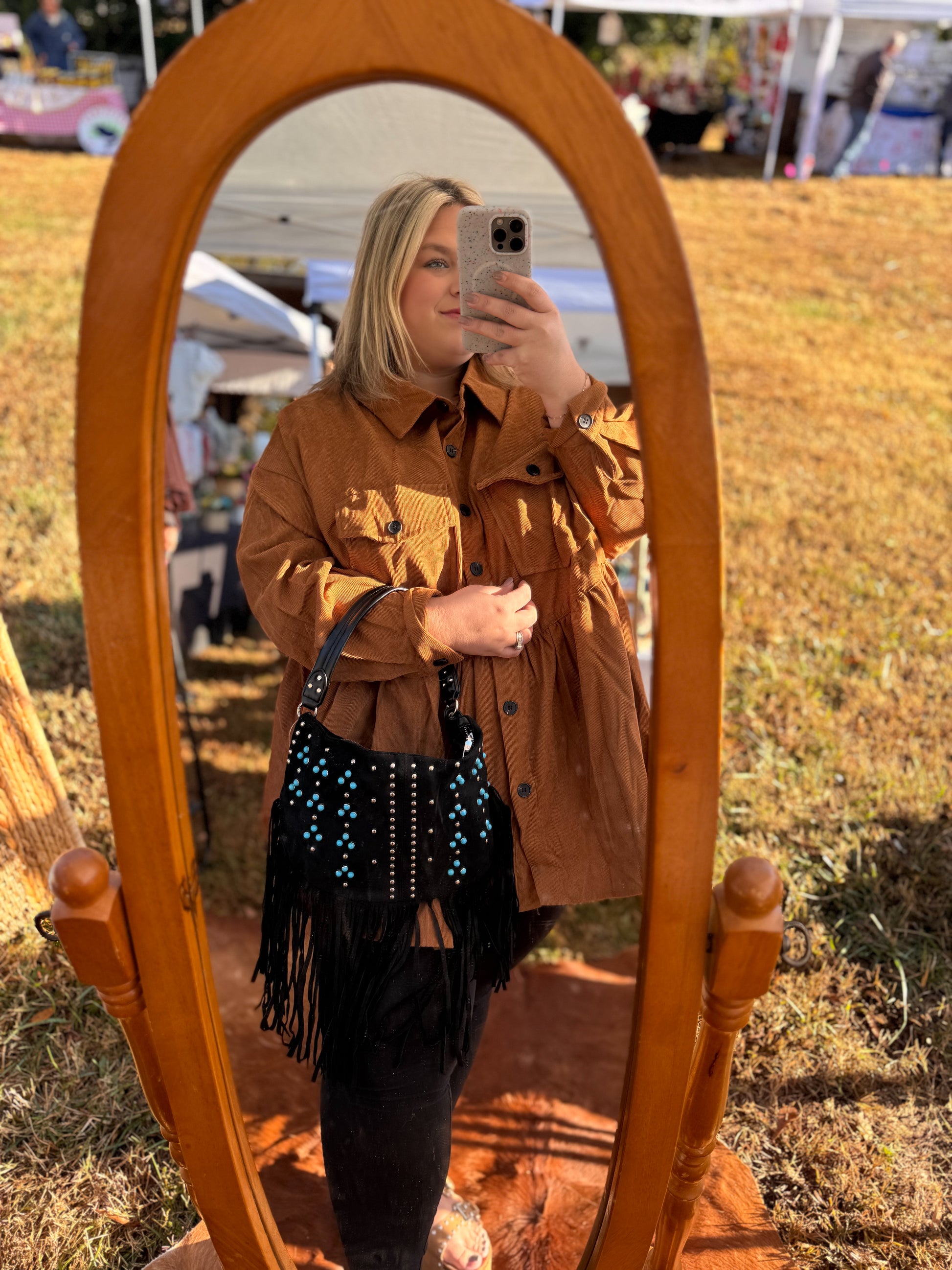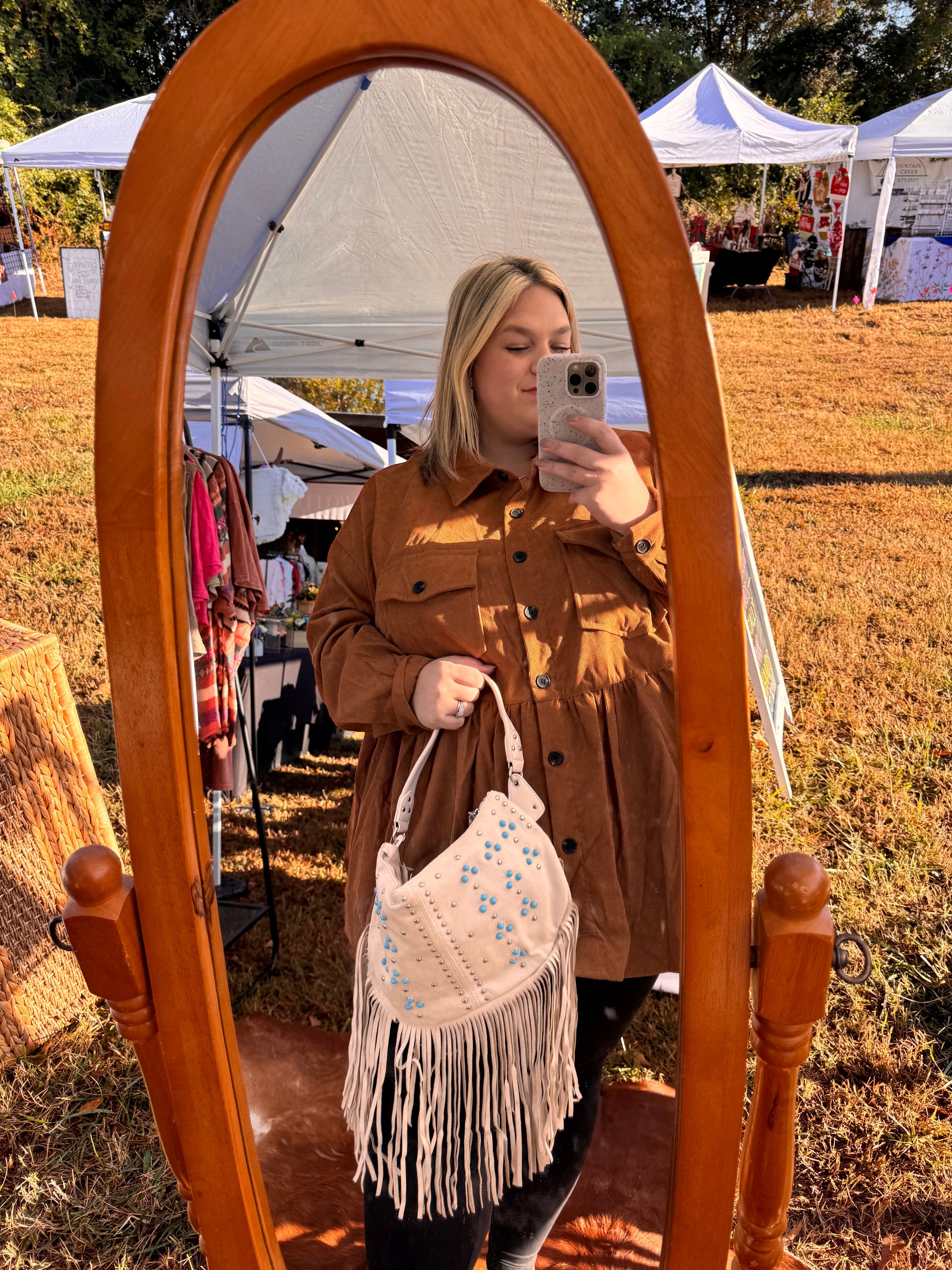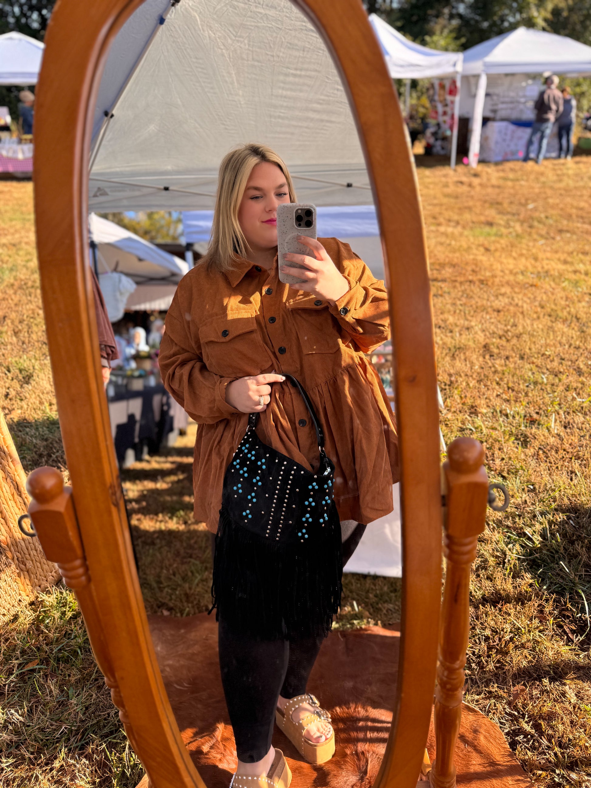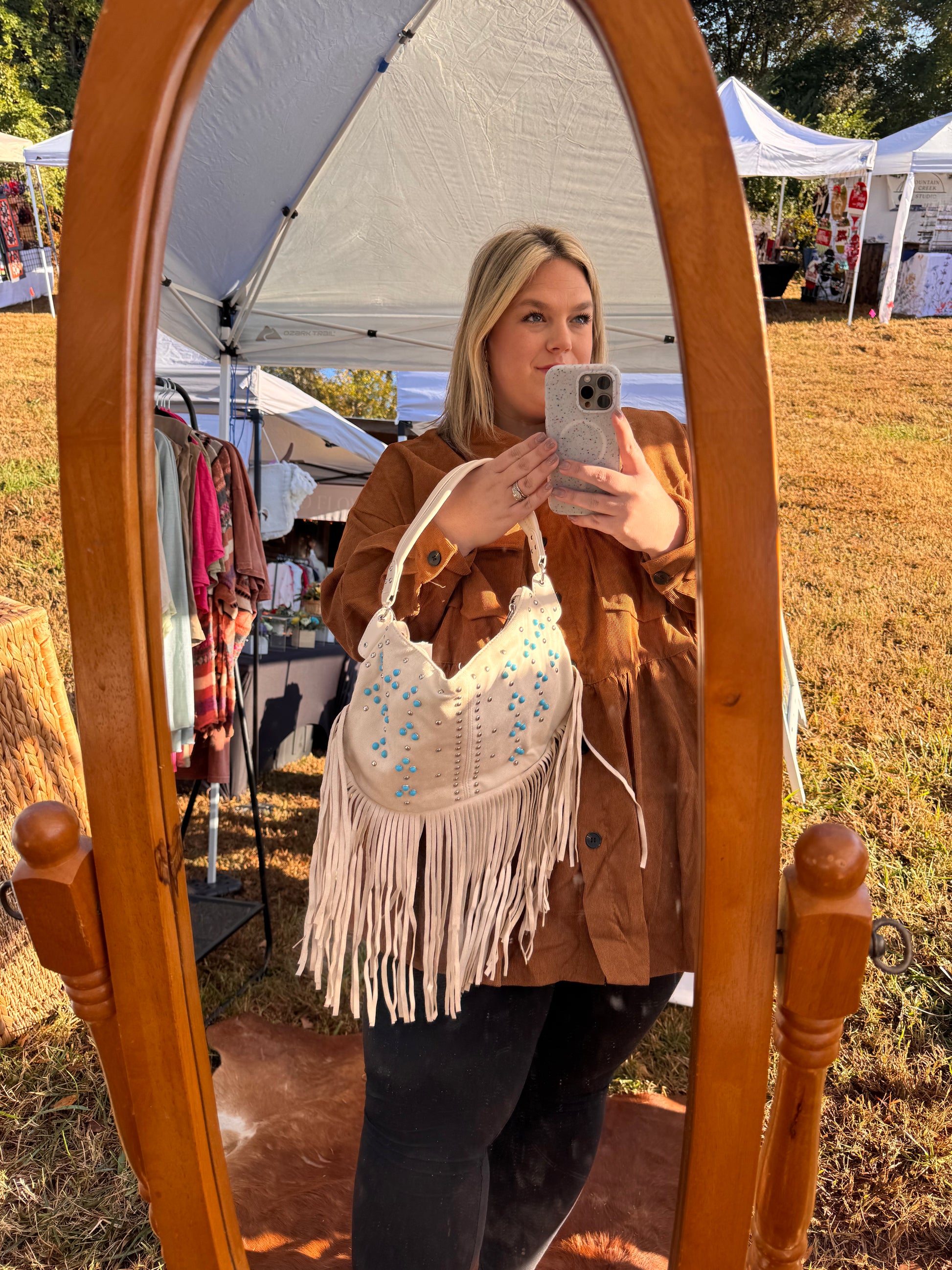 The shoulder bag adds a modern stud pattern, multi fringe hobo style, discover the perfect balance of flair as a shoulder bag effortlessly completes your look.